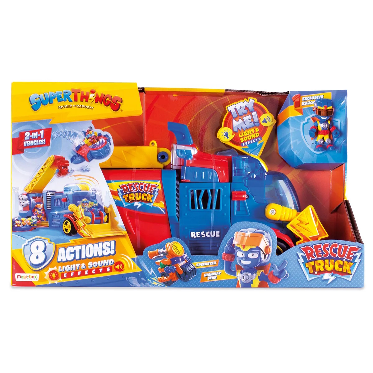 SuperThingsy jadą na ratunek! Dzięki ciężarówce Rescue Truck, Kazoom Kids i SuperThingsy mogą pomóc każdemu mieszkańcowi Kaboom City. Dzięki drabinie dotrą do najwyższych i najbardziej nieprzyjaznych miejsc, choćby po to, by uratować kotka, który utknął na drzewie, a za pomocą armatki wodnej ugasić pożar w każdym budynku! A jeśli muszą się unieść jeszcze wyżek, mogą odczepić „latający" pojazd i rozwinąć skrzydła. Dzięki wielkiej łopacie z przodu auta z dużą łatwością mogą schwytać Złoczyńców i zamknąć ich w więzieniu będącym częścią ciężarówki. Ale uwaga! Złoczyńcy zawsze mają plan ucieczki, więc jeśli nacisną odpowiedni przycisk, klapa się otworzy i znów uda im się uciec! Pozwól swoim SuperThingsom wziąć udział w tej niezwykłej przygodzie i przemieszczać się po mieście w Rescue Truck, by dzięki efektom świetlnym i dźwiękowym dotrzeć na czas z pomocą tam, gdzie jest potrzebna. Akcja gwarantowana!