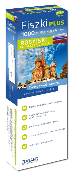 Czy wiesz, że 1000 słów wystarczy, by czytać ze zrozumieniem 70% tekstów użytkowych w języku obcym? Fiszki Plus to kompleksowy system nauki – poznasz z nim ponad 1000 najważniejszych słów, a także wzory odmian, formy nieregularne oraz poprawną wymowę. Przykładowe zdania do KAŻDEGO słówka to gotowe wzorce komunikacyjne, dzięki którym przećwiczysz ich użycie w kontekście. System Fiszki Plus pozwoli Ci szybko opanować podstawy i umożliwi swobodne porozumiewanie się w języku rosyjskim.