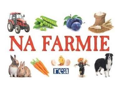 Kartonowa składanka dla dzieci prezentująca pojęcia związane z życiem i pracą na farmie- maszyny rolne, zwierzęta hodowlane, narzędzia itd.