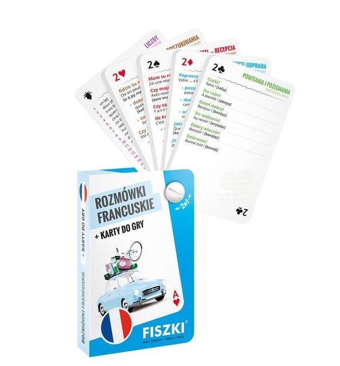 2w1, czyli minirozmówki i karty do gry w jednym! Na kartach szybko odnajdziesz potrzebne słowa i zwroty. A w czasie nudy czy niepogody zagrasz nimi w brydża czy ułożysz pasjansa. 350 niezbędnych słów i zwrotów w 4 kategoriach: - podstawowe zwroty - podróżowanie - noclegi i zwiedzanie - jedzenie i zakupy