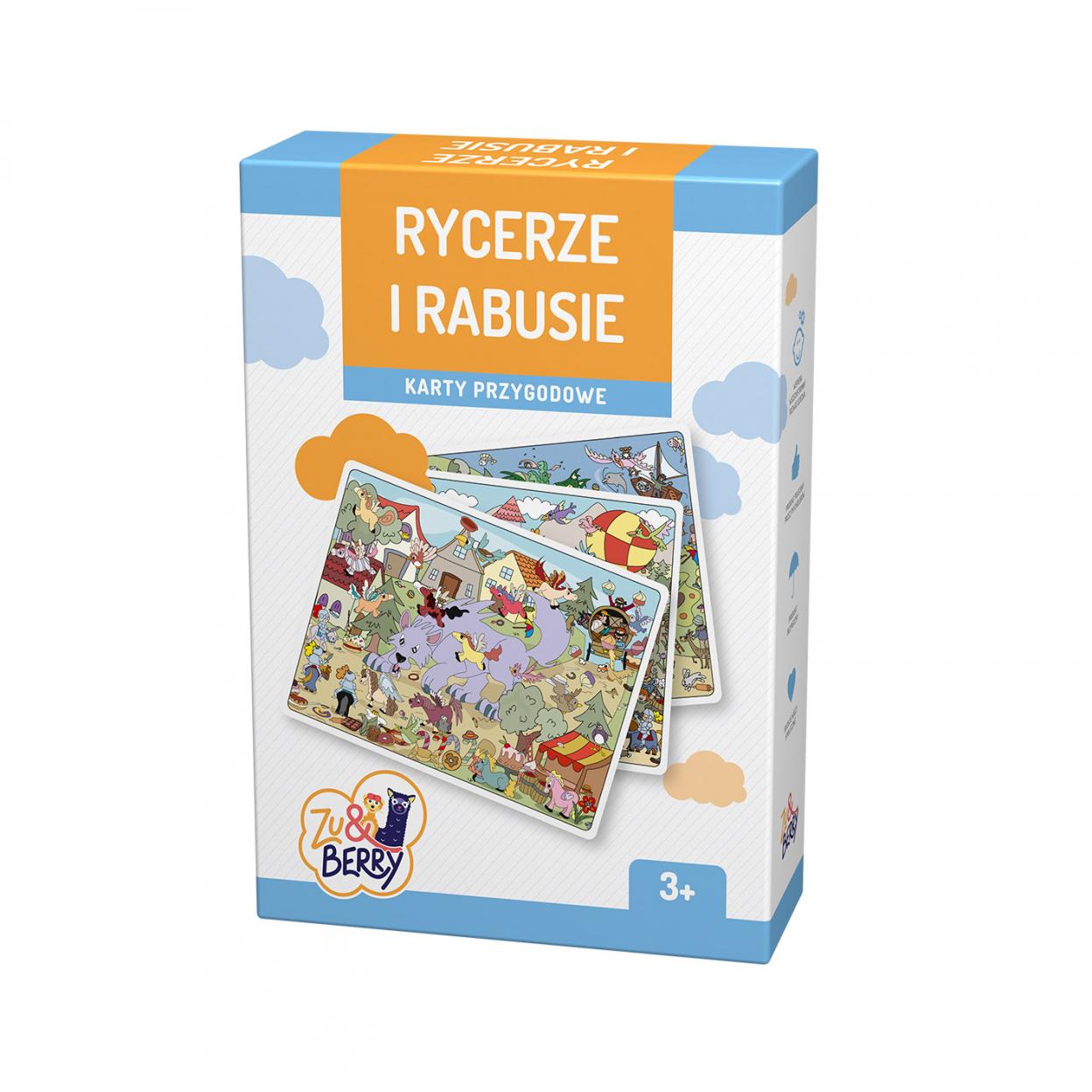 KARTY PRZYGODOWE DLA DZIECI Rycerze i Rabusie to idealny sposób na rozwój wyobraźni i kreatywności małego dziecka. Stanowią doskonała metodę nauki logicznego myślenia oraz stymulacji rozwoju percepcyjnego. Rycerze i Rabusie to zestaw 13 dużych baśniowych kart z instrukcja oraz 30 mniejszych okrągłych kart z przedmiotami do odszukania. Karty przygodowe to zabawa, relaks i nauka w jednym, na dodatek w barwnej, podsycającej ciekawość szacie graficznej. Rekomendowane przez psychologów od 3 roku życia do wesołej, rodzinnej zabawy. Największy, pozytywny wpływ na rozwój dziecka ma ten rodzic, który spędza ze swoim maluchem czas na wspólnej zabawie, na odkrywaniu świata. Stymulują i rozwijają percepcję najmłodszych Uruchamiają ich zdolności poznawcze (np. poprzez wyszukiwanie części z całości) Usprawniają myślenie logiczne. To zabawa, relaks i nauka w jednym.