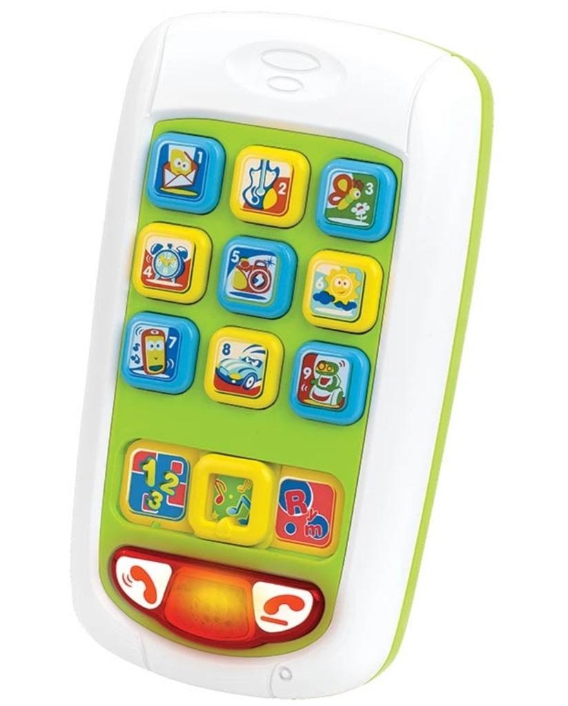 Kolorowy Smartfonik z możliwością wybrania różnych funkcji. Pierwsza funkcja: uczy dziecko rozpoznawania cyferek. Druga funkcja: bawi wesołymi dźwiękami. Trzecia funkcja: uczy i bawi za pomocą rymowanek.