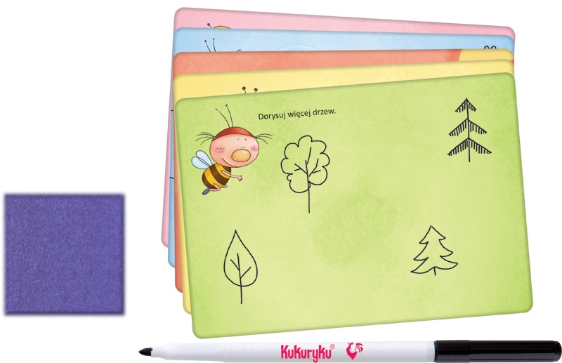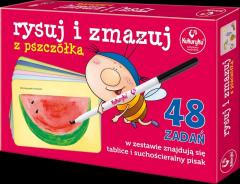Rysuj i zmazuj to zestaw tablic suchościeralnych z mazakiem i 48 zabawnymi zadaniami z pszczółką, które przygotowują dzieci do nauki pisania, pomagają w koncentracji, zachęcają je do pracy oraz uczą precyzji.