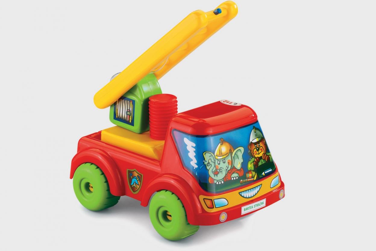 Duży samochód w ksztalcie straży pożarnej z rozkładaną drabiną i funkcją lania wody.