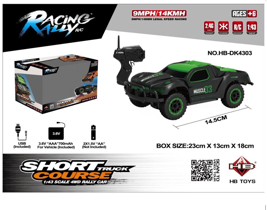 Zdalnie sterowany samochód o rozmiarze 14.5 cm. Rozpędza się do 14 km/h.