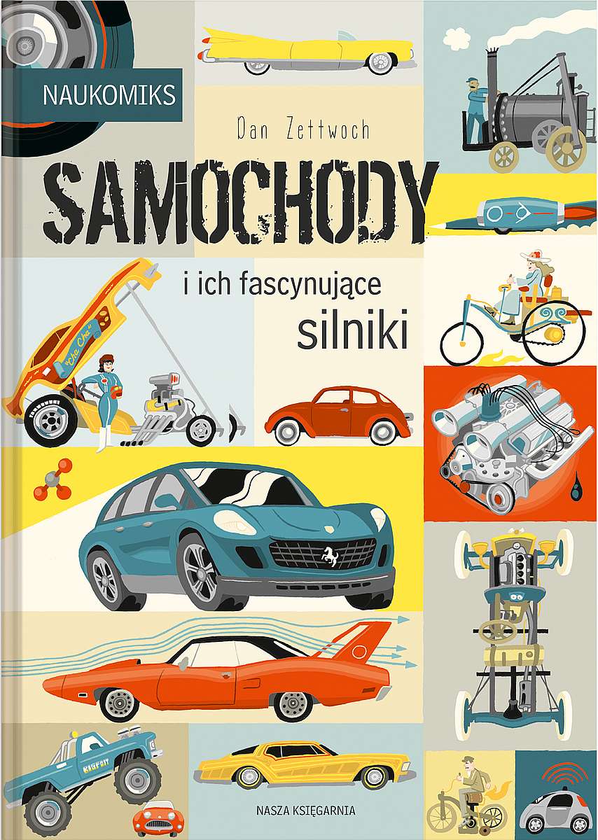 Przygotuj się do badania głębin oceanów, dalekiego kosmosu i wszystkiego po drodze! Krwiożercze rekiny, skomplikowane roboty, upierzone welociraptory i dużo więcej czeka na ciebie w NAUKOMIKSACH! WRZUĆ WYŻSZY BIEG Z „SAMOCHODAMI”! Najpierw ujarzmiliśmy ogień. Potem wynaleźliśmy koło. W tym momencie ludzkość znalazła się na drodze prowadzącej nieubłaganie do powstania nowego środka lokomocji, który daleko w tyle zostawi nasze stopy, a nawet silne końskie kopyta. Wyrusz z nami na przejażdżkę! Poznaj ekscentrycznych wynalazców majsterkujących w garażach i auta produkowane masowo przez globalne korporacje. Dowiedz się, skąd biorą się samochody i jak działają. Co zobaczymy, gdy zajrzymy pod maskę? W jaki sposób benzyna – lub akumulator elektryczny, a nawet para wodna – wprawiają auto w ruch? Uruchom silnik i przekonaj się, jak samochody wpływają na życie miliardów ludzi i otaczającego nas świata. Brrrum, brrrum! Dan Zettwoch jest autorem komiksów obyczajowych, żartów rysunkowych, diagramów i obrazów w stylu ludowym, które zdobią ściany jego domu w St. Louis w stanie Missouri. Dotychczas ukazało się kilka jego książek, między innymi „Birdseye Bristoe, Amazing Facts & Beyond!” [Zdumiewające fakty i nie tylko!], napisanej wspólnie z Kevinem Huizengą, a także wielu minikomiksów opublikowanych własnym sumptem. Niedawno ukończył serię ilustracji wykonanych w domu techniką druku sitowego, które przedstawiają różne nieapetyczne potrawy, statystyki baseballowe oraz wielkie ciężarówki. Pierwszym samochodem, jaki posiadał, było srebrne volvo 740 turbo z 1984 roku. „Samochody” są jego pierwszą książką z serii „Naukomiks”. Powyższy opis pochodzi od wydawcy.