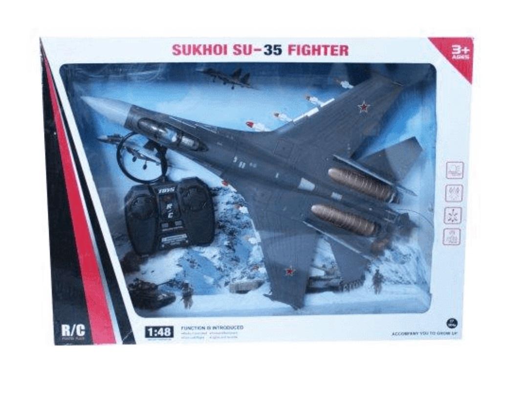 samolot SU-35 (46 cm), skala 1:48, światło, dźwięk, pełne sterowanie radiem, zasilanie: samolot 4xAA, pilot 2xAA (nie są dołączone)