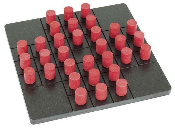 Zasady gry • Na 33 polach rozmieszczonych na planie krzyża umieszczamy 32 pionki (tylko jedno pole powinno pozostać puste). • Pionek może przeskoczyć przez sąsiedni tylko wtedy, gdy za pionkiem przeskakiwanym jest wolne miejsce. Po takim ruchu pionek przeskakiwany zostaje usunięte z planszy. • Nie można wykonywać żadnych innych ruchów (przesuwanie pionka na sąsiednie pola, bicie po skosie, przeskakiwanie więcej niż jednego pionka w jednym ruchu). • Gra dobiega końca, gdy na planszy pozostanie tylko jeden pionek.Produkt dopuszczony do obrotu w UE zgodnie z posiadanym certyfikatem CE oraz zgodnością z normą EN-71. Produkt objęty rękojmią za wady.