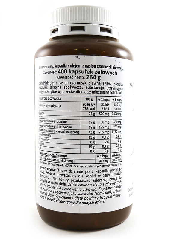 Produkt w jednej kapsułce zawiera 500 mg oleju z nasion czarnuszki siewnej.