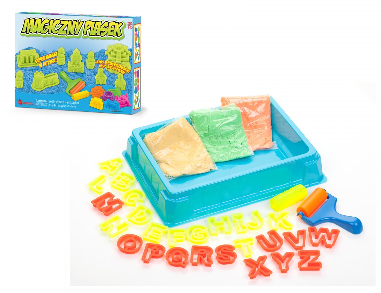 3 opakowania piasku kinetycznego po 300 g, 26 foremek w kształcie literek, 2 narzędzia do zabawy piaskiem, 1 tacka