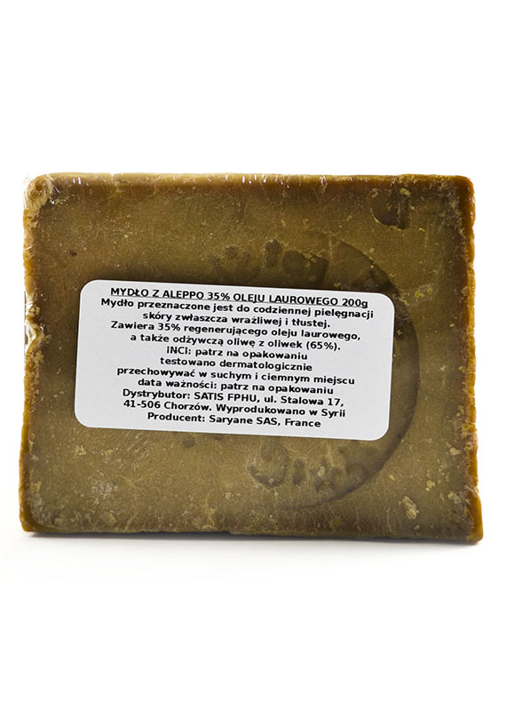 Mydło Aleppo przeznaczone głównie do pielęgnacji skóry z problemami. Zawiera 35% oleju laurowego oraz 65% oliwy z oliwek. Z tego też powodu mydło posiada duże właściwości regenerujące. Łagodzi i przynosi ulgę skórze pozostawiając ją dobrze nawilżoną. Nie zawiera składników zapachowych, naturalnie pachnie olejem laurowym i oliwą z oliwek.