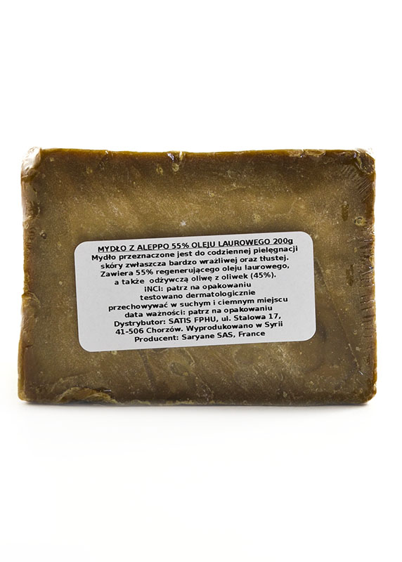 Mydło Aleppo 55% przeznaczone w szczególności do skóry problematycznej, tłustej, bardzo wrażliwej i alergicznej. Zostało wytworzone z naturalnych składników: z wysokiej zawartości oleju laurowego (55%) oraz odżywczej oliwy z oliwek (45%). Posiada silne działanie regenerujące, antyseptycznie i nawilżające. Stosowane regularnie przynosi poprawę w kondycji skóry. Nie posiada sztucznych składników zapachowych.