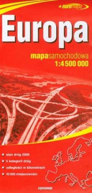 Cały obszar Europy w jednej skali 1:4 500 000, stan dróg 2011, autostrady w budowie, 5 kategorii dróg, numeracja dróg międzynarodowych, odległości drogowe w kilometrach, promy samochodowe, indeks ponad 10 000 miejscowości.