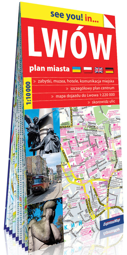 Spacer po pełnym reprezentacyjnych kamienic Rynku Głównym, wizyta w katedrze Łacińskiej, zaduma na cmentarzach Łyczakowskim i Orląt. Zakupy na słynnym bazarze Krakowskim i podziwianie panoramy miasta z kopca Unii Lubelskiej. Plan interesujących dla turysty, centralnych dzielnic w szczegółowej skali 1:10 000 (1 cm – 100 m) pomoże odnaleźć atrakcje Lwowa.