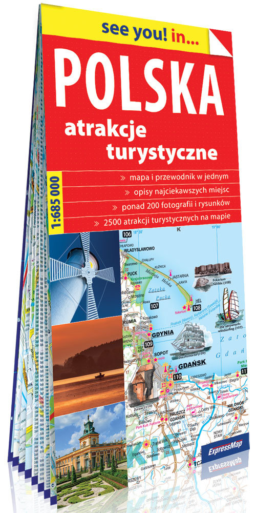 Praktyczne połączenie szczegółowej kartografii i bogatego w treść przewodnika. Na mapie Polski zaznaczono ponad 2500 atrakcji turystycznych, a najciekawsze z nich wyróżniono setką kolorowych rysunków. Dodatkowe mapy przedstawiają najpopularniejsze regiony turystyczne kraju. Z kolei na stronie przewodnikowej znajdują się opisy 161 najciekawszych miejsc wzbogacone ilustracjami, fotografiami oraz planami. To nie tylko zamki, pałace i kościoły, lecz także zabytki techniki, parki rozrywki, atrakcje dla dzieci i osobliwości przyrodnicze. Napisane lekko i z polotem teksty, ciekawy układ graficzny, duża liczba fotografii i rysunków sprawiają, że część przewodnikowa jest przystępna i atrakcyjna. Podział treści według województw oraz spójna numeracja atrakcji turystycznych w przewodniku i na mapie zapewniają łatwą nawigację. Obiekt, o którym czytasz, szybko i bez trudu zlokalizujesz na mapie.