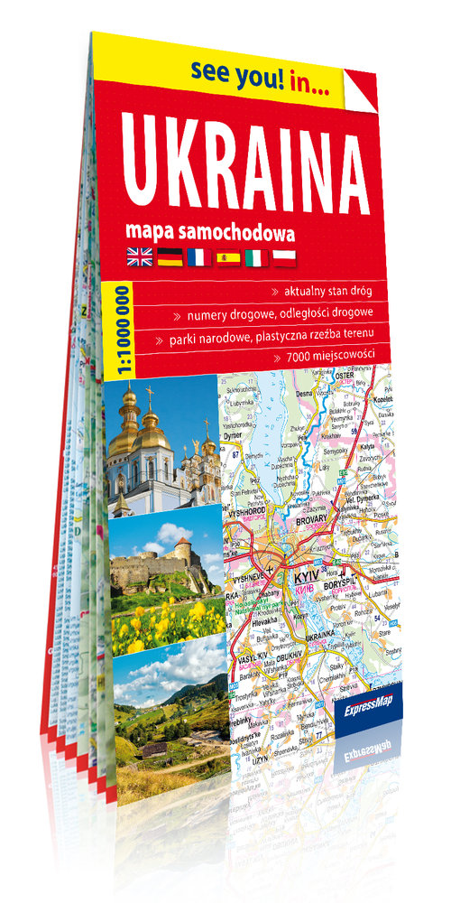 Mapa zawiera: stan dróg 2018, odcinki w budowie, szczegółowa kategoryzacja i numeracja dróg, odległości drogowe w kilometrach, plastyczna rzeźba terenu, lasy, parki narodowe, skorowidz miejscowości.