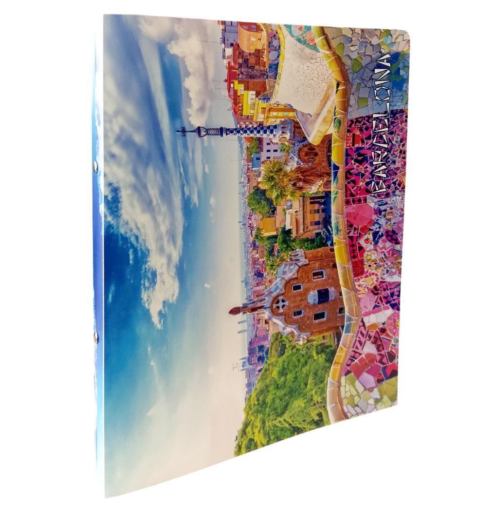 -wykonany z nadrukowanego mocnego PP -grubości 500 mic -grzbiet o grubości 35 mm -okucie 2R -wymiary 25,5 x 31,5 x 3,5 cm
