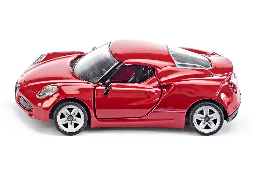 Model ekskluzywnego samochodu sportowego Alfa Romeo 4c. Model charakteryzuje elegancka sportowa sylwetka, otwierane drzwi, widoczny pod szybą silnik oraz jasno czerwony kolor.