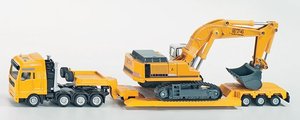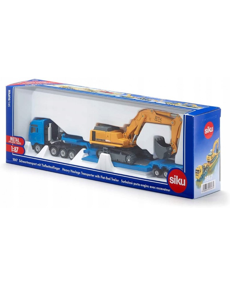Model ciężarówki wykonany z metalowych i plastikowych części w skali 1:87 z zachowaniem szczegółów pojazdu rzeczywistego, wyposażony w rozkładaną lawetę dostosowaną do przewozu koparki. Stabilna konstrukcja i gumowe koła zapewniają swobodny i bezpieczny przewóz dołączonej do zestawu koparki gąsienicowej, wyposażonej w ruchome elementy umożliwiające nabieranie i przewożenie drobnych przedmiotów.