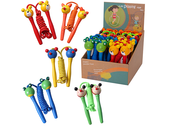 Drewniana skakanka to rewelacyjna zabawka dla każdego dziecka,lakierowana rękojeść skakanki przedstawia różne zwierzatka. Zabawa ze skakanką rozwija zdolności ruchowe i zmysł koncentracji u dziecka. Stymuluje prawidłowy rozwój fizyczny, pomaga kształtować mięśnie rąk i nóg.