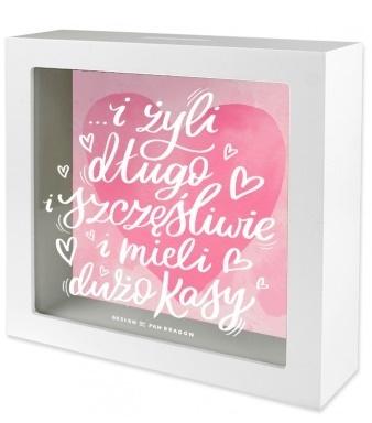 Skarbonka wykonana jest z MDFU i szkła, jest zapakowana w kolorowe pudełko,