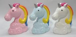 Kolorowa, ceramiczna skarbonka w kształcie jednorożca .