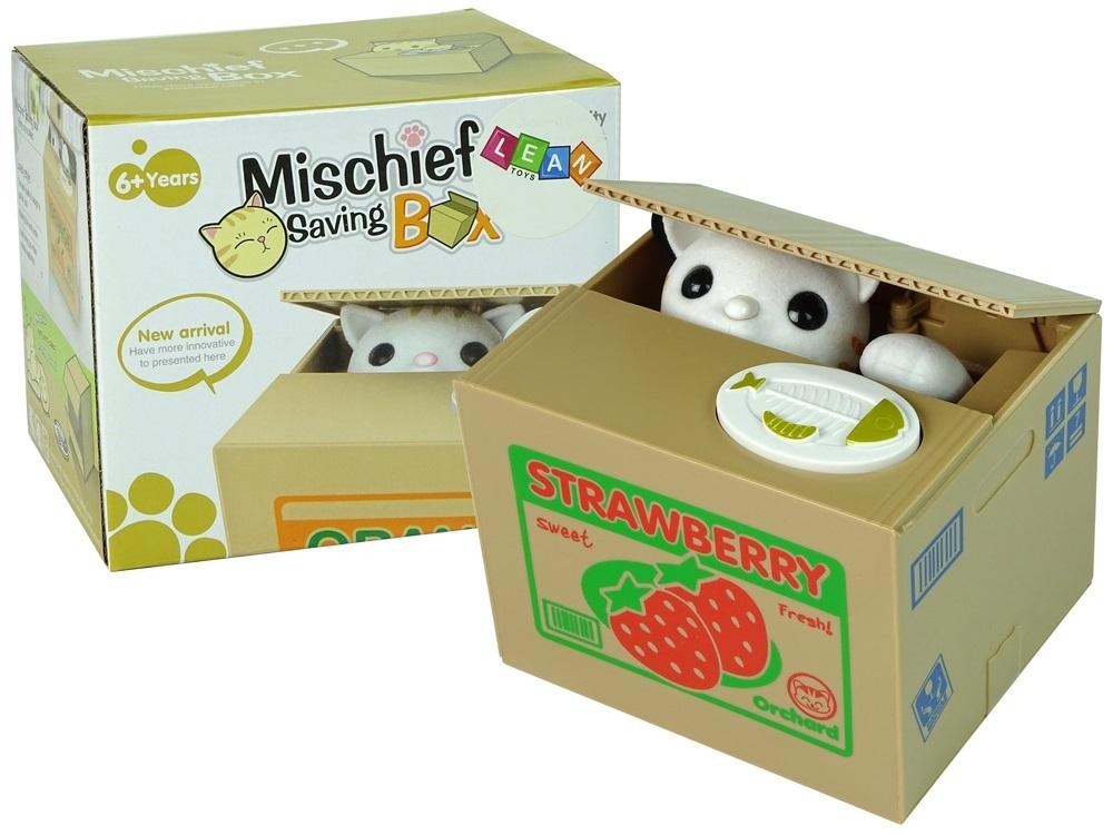 Naciśnij przycisk na budce a kot dźwignie pokrywkę i łapką wciągnie pieniążka.