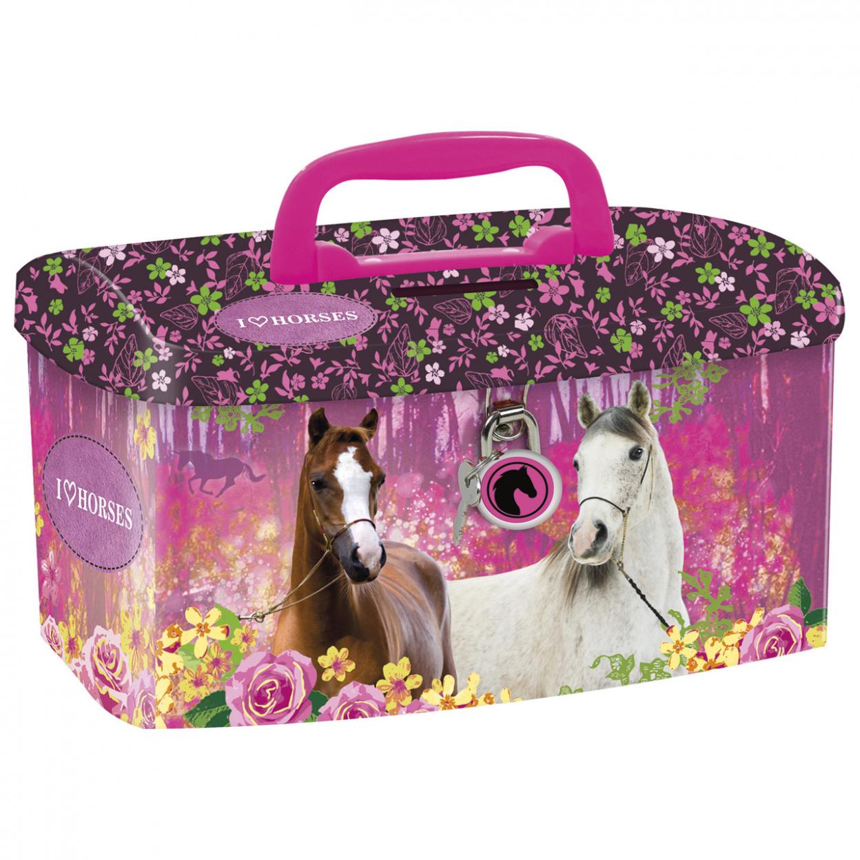 Skarbonka posiada plastikowy uchwyt oraz kłódkę z dwoma kluczykami