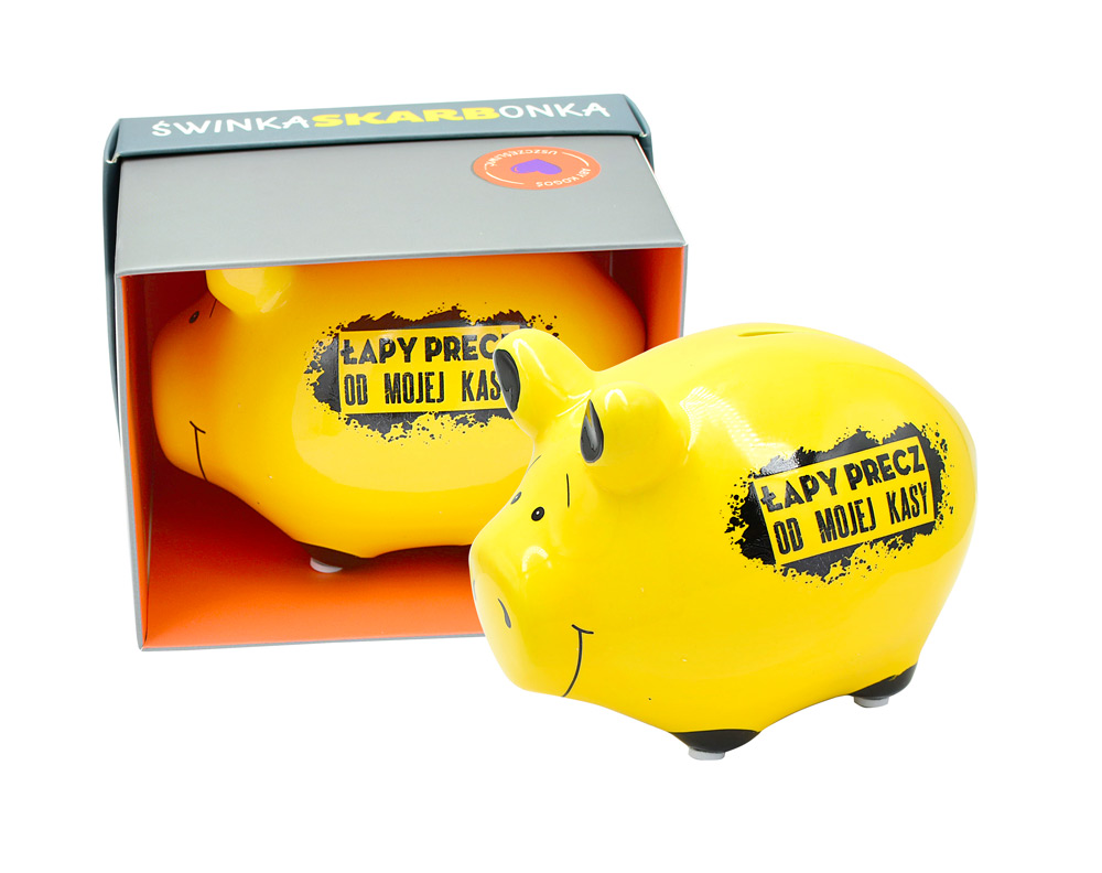 Skarbonka mała świnka SKM-018 "Łapy precz od mojej kasy" Ceramiczna skarbonka w kształcie świnki to świetny pomysł na prezent. Świnki są kolorowe i ozdobione zabawnymi tekstami, świetnie się sprawdzą jako dekoracja pokoju. Cechy szczególne: Typ produktu: skarbonka na prezent, Materiał: ceramika Wys. świnki: 8,5 cm. Waga: 214 g Wymiary pudełka: 12,5 x 10 x 10 cm (dł x szer x wys) Opakowanie: kolorowy kartonik Okazja: ogólne życzenia, urodziny