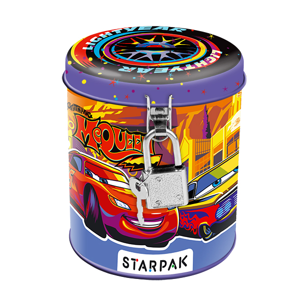 Skarbonka w okrągłym kształcie z lakierowanego metalu, zamykana na kłódkę. Zdobiona wizerunkiem samochodów z filmu Auta..