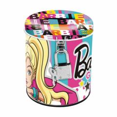 Skarbonka w okrągłym kształcie z lakierowanego metalu, zamykana na kłódkę. Zdobiona wizerunkiem Barbie.