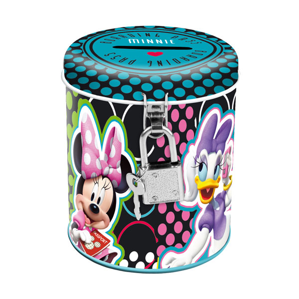 Skarbonka w okrągłym kształcie z lakierowanego metalu, zamykana na kłódkę. Zdobiona wizerunkiem Minnie