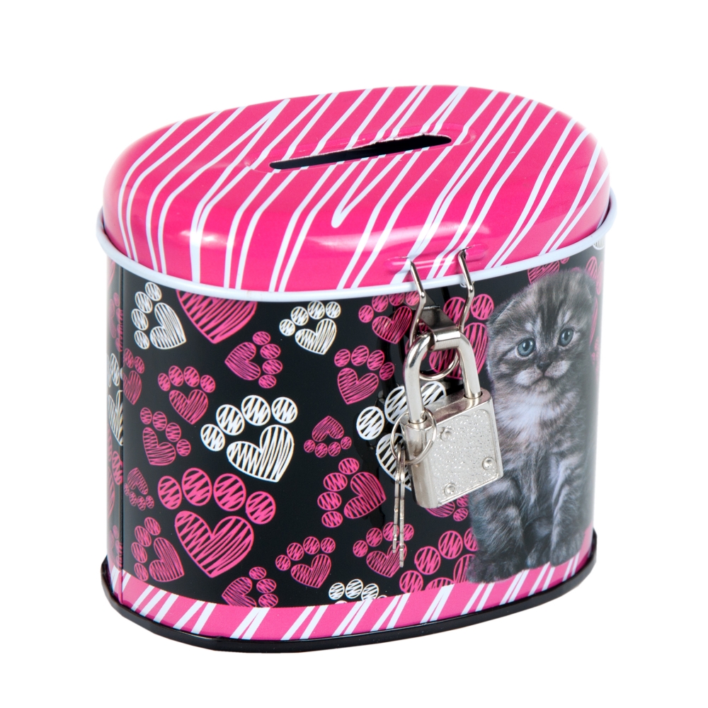Skarbonka z lakierowanego metalu z otwieranym wieczkiem, zamykana na kłódkę w zestawie z dwoma kluczykami. Idealny pomysł na prezent, który uczy oszczędności i sprawia, że pieniądze są bezpieczne. Skarbonka jest zdobiona słodkimi zwierzątkami.
