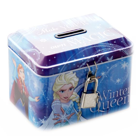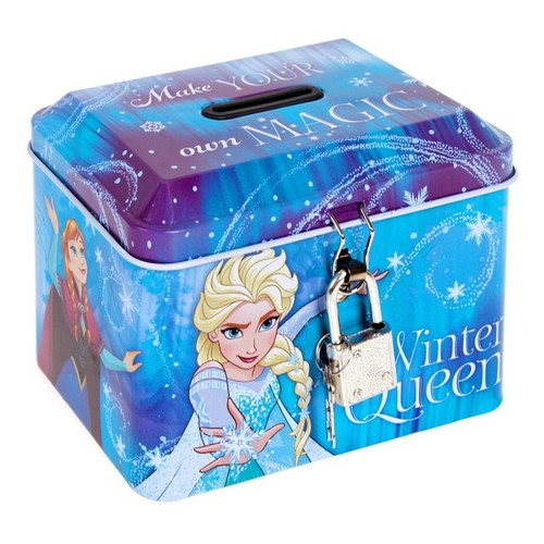 Prostokątna skarbonka z lakierowanego metalu z otwieranym wieczkiem, zamykana na kłódkę w zestawie z dwoma kluczykami. Idealny pomysł na prezent, który uczy oszczędności i sprawia, że pieniądze są bezpieczne. Skarbonka jest zdobiona nadrukiem ulubionych bohaterów.
