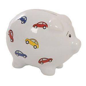 Porcelanowa skarbonka dla dzieci - biała świnka w samochody.