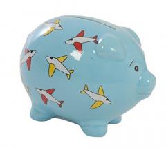 Porcelanowa skarbonka dla dzieci - niebieska świnka w samoloty.