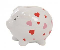 Porcelanowa skarbonka dla dzieci - biała świnka w serduszka.