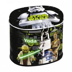 Skarbonka z lakierowanego metalu z otwieranym wieczkiem, zamykana na kłódkę w zestawie z dwoma kluczykami. Idealny pomysł na prezent, który uczy oszczędności i sprawia, że pieniądze są bezpieczne. Skarbonka jest zdobiona ulubioną bohaterami Star Wars.