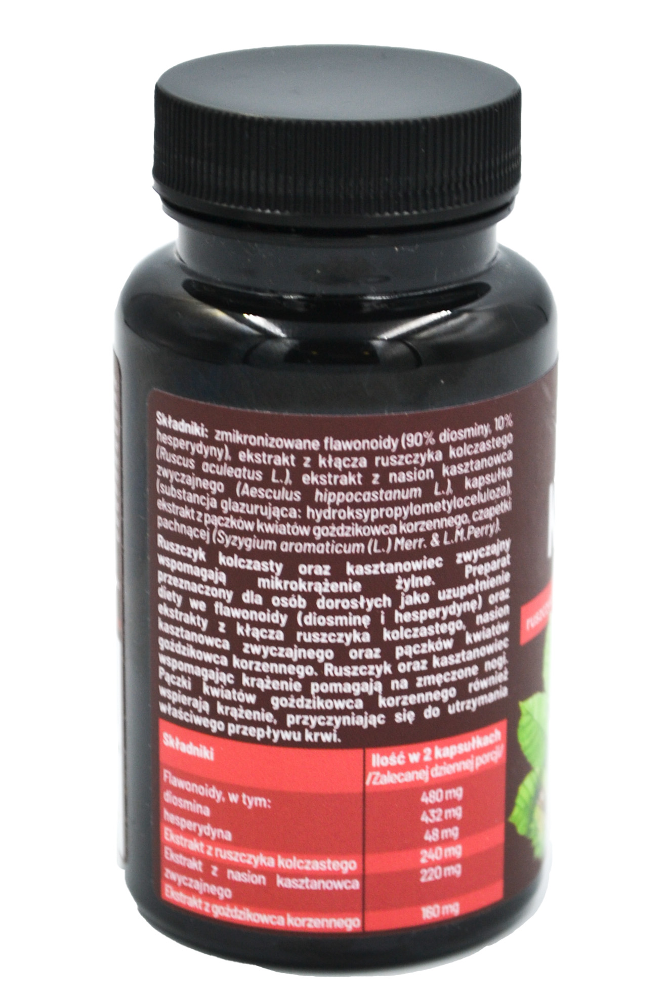 Zmikronizowane flawonoidy (90% diosminy, 10% hesperydyny), ekstrakt z kłącza ruszczyka kolczastego (Ruscus aculeatus L.), ekstrakt z nasion kasztanowca zwyczajnego (Aesculus hippocastanum L.), substancja wypełniająca (celuloza), kapsułka (substancja glazurująca: hydroksypropylometyloceluloza), ekstrakt z pączków kwiatów goździkowca korzennego, czapetki pachnącej (Syzygium aromaticum (L.) Merr. & L.M.Perry).