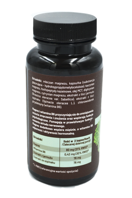 mleczan magnezu, kapsułka (substancja glazurująca - hydroksypropylometyloceluloza), taurynian magnezu, fosfopeptydy kazeinowe, olej MCT, diglicynian magnezu, cytrynian magnezu, ekstrakt z liści jarmużu (Brassica oleracea var. Sabellica), ekstrakt z liści szpinaku (Spinacia oleracea L.) chlorowodorek pirydoksyny (witamina B6).
