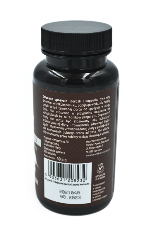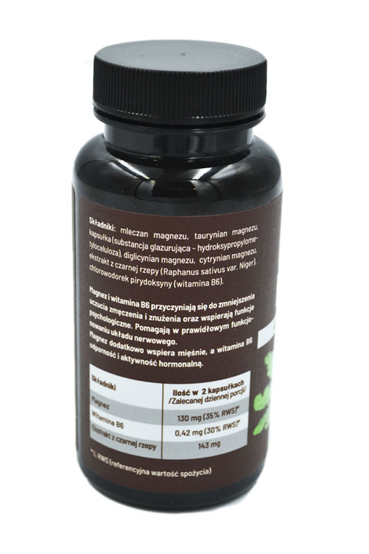mleczan magnezu, taurynian magnezu, kapsułka (substancja glazurująca- hydroksypropylometyloceluloza), diglicynian magnezu, cytrynian magnezu, ekstrakt z czarnej rzepy (Raphanus sativus var. Niger), chlorowodorek pirydoksyny (witamina B6).