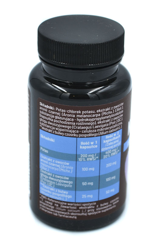 chlorek potasu, ekstrakt z owoców aronii czarnoowocowej (Aronia melanocarpa (Michx.) Elliot.), substancja wypełniająca - celuloza mikrokrystaliczna, ekstrakt z owoców głogu dwuszyjkowego (Crataegus Laevigata (Poir.) DC.), substancja glazurująca - hydroksypropylometyloceluloza (kapsułka pochodzenia roślinnego), **ekstrakt z bulwy czosnku pospolitego (Allium sativum L.), .