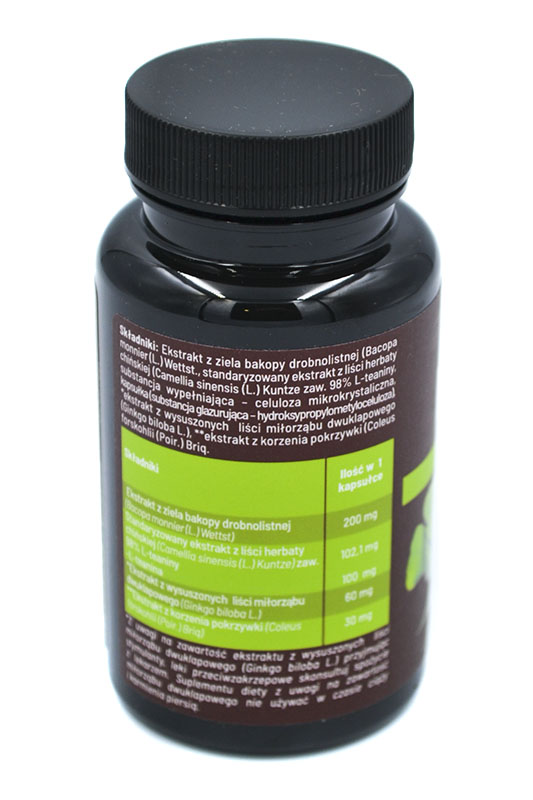 ekstrakt z ziela bakopy drobnolistnej (Bacopa Monnier (L.) Wettst), standaryzowany ekstrakt z liści herbaty chińskiej (Camellia sinensis (L.) Kuntze zaw. 98% L-teaniny), substancja wypełniająca - celuloza mikrokrystaliczna, kapsułka (substancja glazurująca - hydroksypropylometyloceluloza), *ekstrakt z wysuszonych liści miłorzębu dwuklapowego (Ginkgo biloba L.), **ekstrakt z korzenia pokrzywki (Coleus forskohlii (Poir.) Briq.).