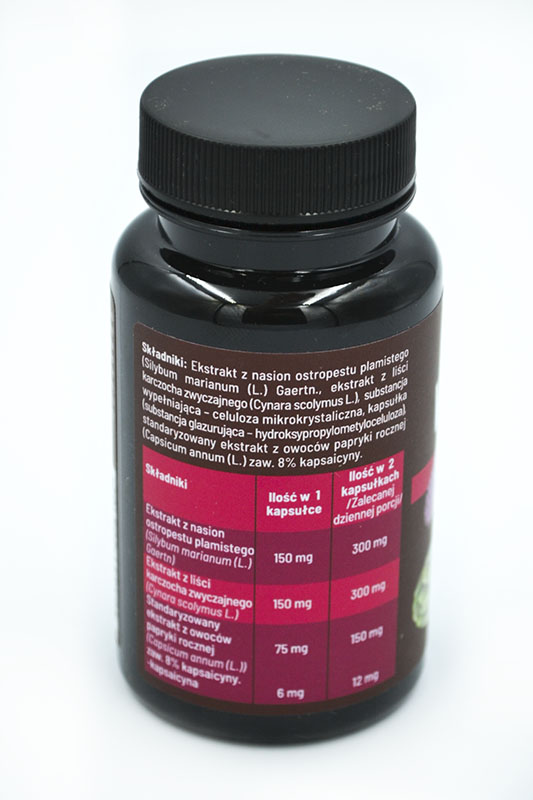 ekstrakt z nasion ostropestu plamistego (Silybum marianum (L.) Gaertn.), ekstrakt z liści karczocha zwyczajnego (Cynara scolymus L.), substancja wypełniająca (celuloza mikrokrystaliczna), kapsułka (substancja glazurująca - hydroksypropylometyloceluloza), standaryzowany ekstrakt z owoców papryki rocznej (Capsicum annum L.).