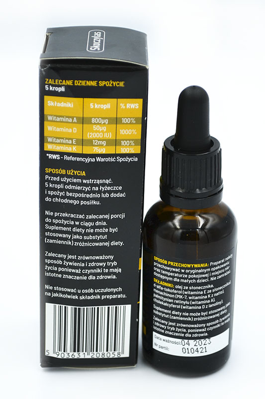 - 30 ml (900 kropli) zawiera 180 sugerowanych dziennych porcji po 5 kropli.
