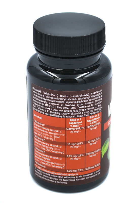 *Witamina C (kwas L-askorbinowy), substancja wypełniająca - celuloza mikrokrystaliczna, substancja glazurująca-hydroksypropylometyloceluloza (kapsułka pochodzenia roślinnego), standaryzowany ekstrakt z owoców aronii czarnej (Aronia melanocarpa (Michx) Elliot) zaw. 40% *witaminy C, standaryzowany ekstrakt z owoców dzikiej róży (Rosa canina L.) zaw. 25% *witaminy C, standaryzowany ekstrakt z owoców malpigia granastolistna - acerola (Malpighia glabra L.) zaw. 25% * witaminy C.