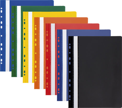 -wykonany z folii PP -przezroczysta przednia okładka, tylna kolorowa -na grzbiecie papierowy pasek do opisu -zaokrąglone wąsy -europerforacja na grzbiecie do wpięcia w segregator A4 -pojemność 2cm (200 kartek) -20 sztuk w opakowaniu zbiorczym