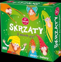 Skrzaty to zestaw wesołych gier dla całej rodziny. Trzech skrzacich braci zachęca do zabawy i nauki. Gry uczą rozróżniania wzorów, kolorów, kształtów, rozpoznawania szczegółów, ich analizowania i porównywania, ćwiczą spostrzegawczość i refleks. Zestaw może służyć do wielu zabaw w domu i w przedszkolu. Szczególnie przyda się do przyswojenia pojęcia zbiorów. W instrukcji znajduje się propozycja trzech gier, wystarczy jednak trochę fantazji, aby wymyślić własne zasady z udziałem skrzatów.