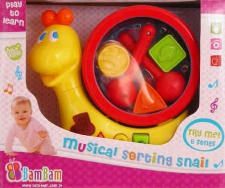 Interaktywny Muzyczny Sorter Ślimak jest zabawką umożliwiającą rozwój dziecka powyżej 18 miesiąca poprzez zabawę. Ślimak -sorter posiada 3 klocki o różnych kształtach, które pomagają dziecku rozwijać koordynację wzrokowo-ruchową i umiejętności motoryczne. 8 melodii do wyboru wraz z migoczącymi przyciskami pobudzają percepcję wzrokową oraz zdolności słuchu. Doczepiony sznurek pozwala na przemieszczanie zabawki gwarantując doskonałą zabawę.