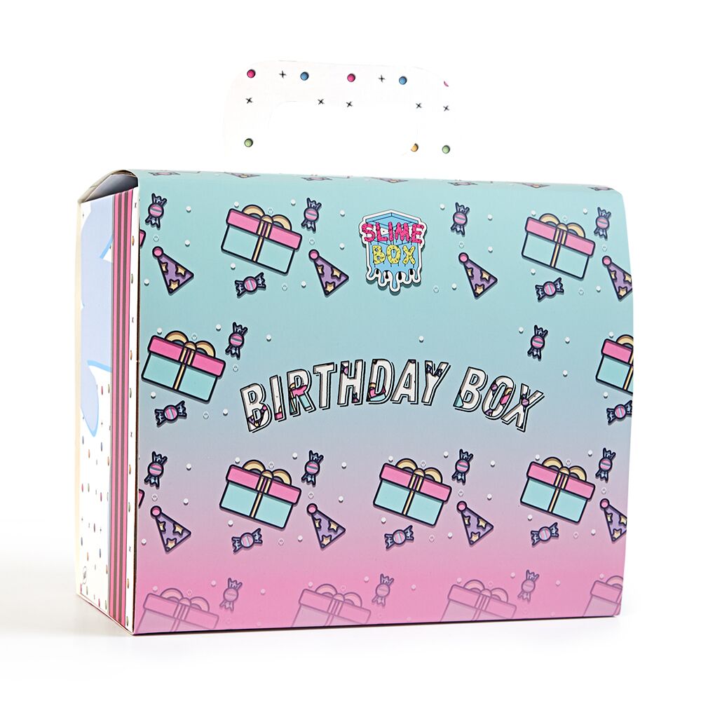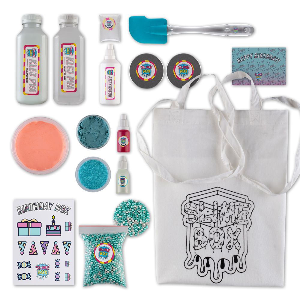 Szukasz idealnego prezentu na urodziny? Wybierz Birthday Slime Boxa! Szczęśliwiec otrzymujący Birthday Boxa wykona z niego kinetic sand slime, crunchy slime oraz butter slime! Dodatkowo w skład Boxa wchodzi aromat o zapachu pianki truskawkowo śmietankowej, aby slime pięknie pachniały oraz szpatułka silikonowa i torba płócienna Slimebox!